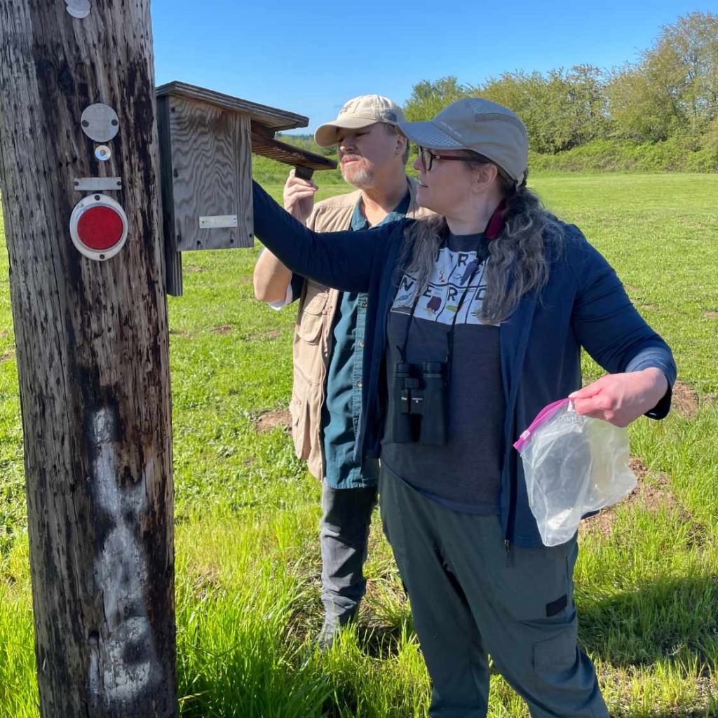 Volunteers place, monitor, and maintain nest boxes constructed to PBRP’s specifications. Boxes are in appropriate habitat that meets the needs of the bluebirds and where pesticides are not generally used. Monitors help guard against the non-native European House Sparrows and Starlings; these aggressive birds compete for nest sites and often kill native Western Bluebirds.